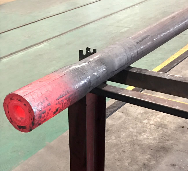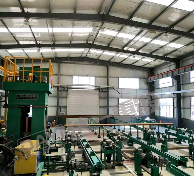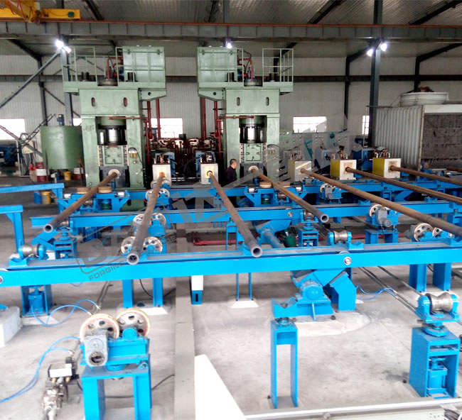 管端加厚機(jī)是我公司針對(duì)石油鉆桿、油管的加厚工藝研發(fā)的新型特種設(shè)備,管端加厚的目的主要是為了保證鋼管在管端車加工截面處的強(qiáng)度,鋼管加厚類型有外加厚、內(nèi)加厚、內(nèi)外加厚三種工藝。加厚機(jī)組有加厚機(jī)、輔機(jī)及加熱系統(tǒng)等組成,即對(duì)鋼管進(jìn)行橫向運(yùn)輸、加熱及端部加厚。
