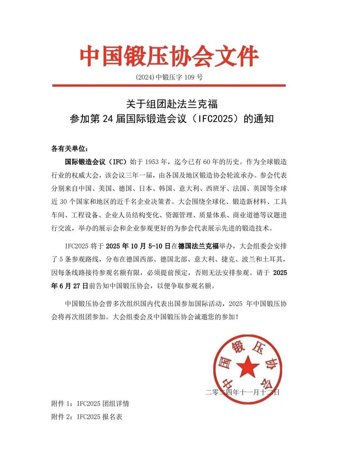 2025年10月5-10日,全球鍛造行業(yè)***高規(guī)格的盛會(huì)——第24屆國(guó)際鍛造會(huì)議在德國(guó)法蘭克福隆重舉行。作為全球鍛造界的"奧運(yùn)會(huì)",IFC2025匯聚了來自30個(gè)國(guó)家的近百名行業(yè)***。我司憑借在精密鍛造領(lǐng)域的技術(shù)實(shí)力和市場(chǎng)影響力,榮幸獲得中國(guó)鍛壓協(xié)會(huì)正式邀請(qǐng),總經(jīng)理高仕恒代表公司隨中國(guó)代表團(tuán)參會(huì),與全球鍛造精英共話行業(yè)未來。